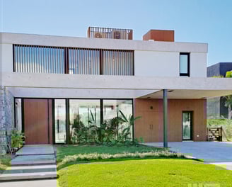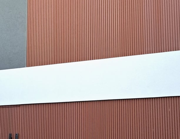 Perfiles WPC en frente, contra frente, pérgola y ocultando aires acondicionados.